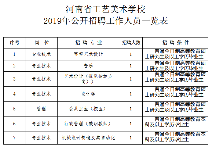 附件:河南省工藝美術學校2019年公開招聘工作人員一覽表