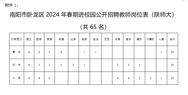 進校園公開招聘教師65名。具體崗位詳見《南陽市臥龍區2024年春期進校園公開招聘教師崗位表》(附件1)。