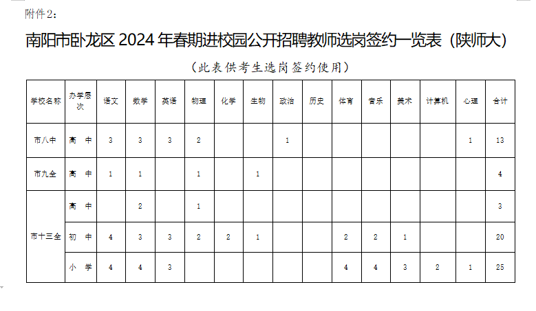 1、南陽市臥龍區2024年春期進校園公開招聘教師崗位表(陜師大)