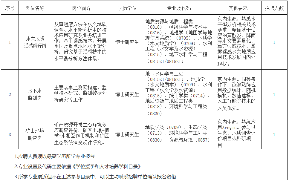 中國地質環境監測院(自然資源部地質災害技術指導中心)是中國地質調查局直屬的正局級公益一類事業單位,主要承擔水文地質與水資源調查監測、地質災害調查監測與防治、自然資源綜合調查、資源環境承載能力與國土空間開發適宜性評價,承擔國土空間生態修復技術支撐,向社會提供公益性服務。根據工作需要,擬面向社會公開招聘3名京內生源應屆畢業生。現將有關事宜公告如下。