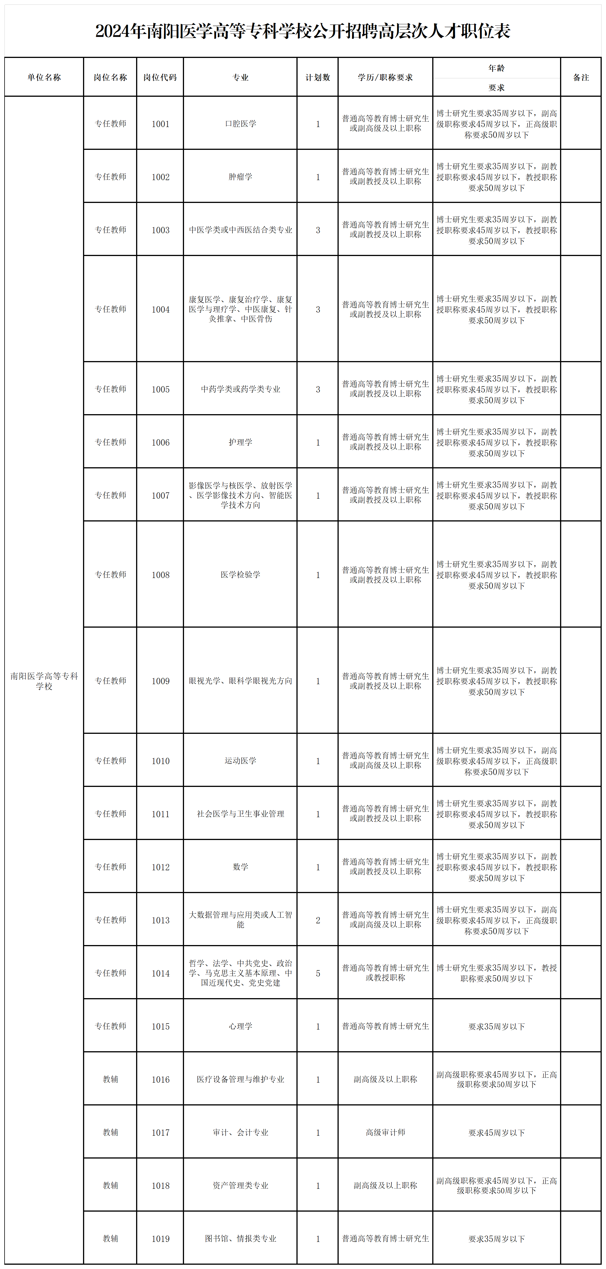 南陽醫學高等專科學校2024年公開招聘高層次人才公告
