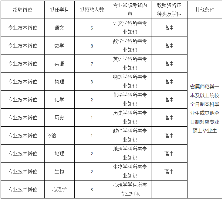2、高層次人才:師范類院校本科專業畢業,具備5年及以上高中教學工作經驗,持有對應學科的高中教師資格證,具有一定的教學教研創新能力;