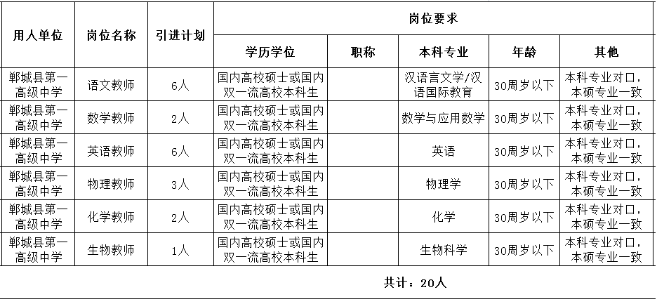 根據鄲城縣第一高級中學編制、崗位空缺及教學需要,面向社會公開招聘高學歷教師20名(其中語文6名、數學2名、英語6名、物理3名、化學2名、生物1名)。