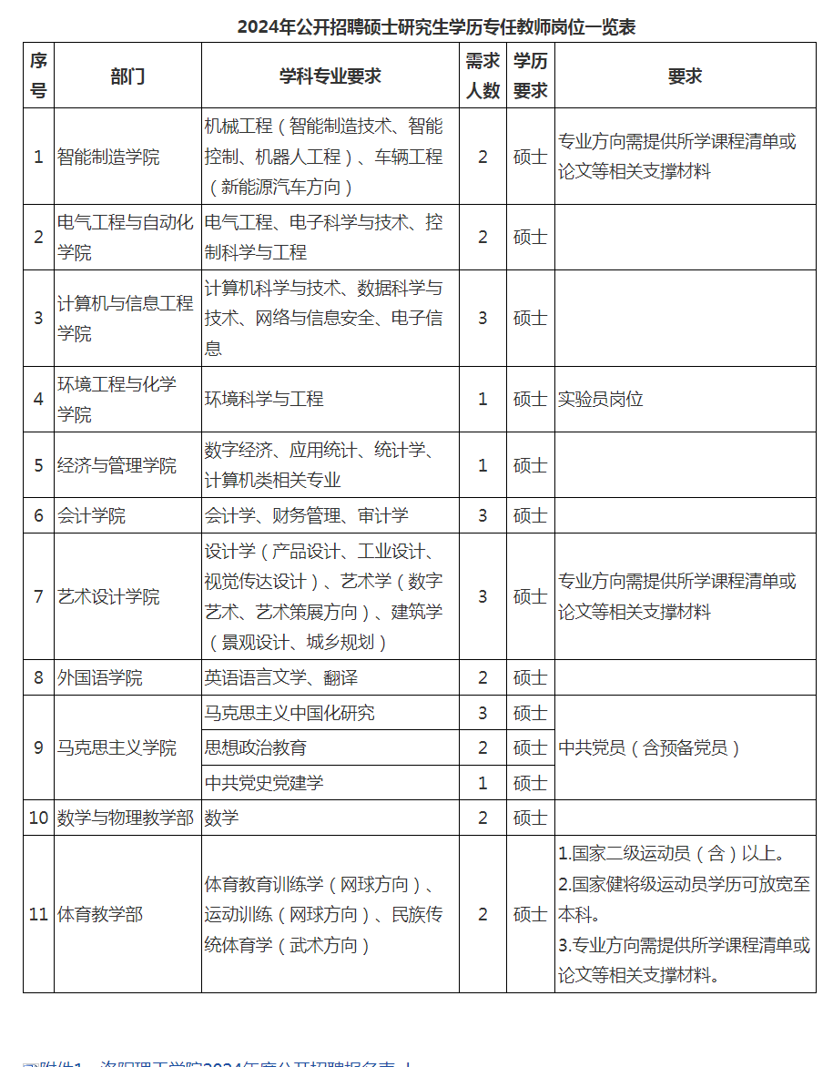 根據學校崗位需求,以人事代理形式招聘27名具有碩士研究生學歷專任教師。詳見附件《洛陽理工學院2024年公開招聘碩士研究生學歷專任教師崗位一覽表》。