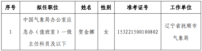 根據 2024 年度中央機關公開遴選公務員工作有關要求,經過筆試、面試、體檢和考察等程序,經研究,確定賀金娜同志為中國氣象局公開遴選參照公務員法管理事業單位機關工作人員擬任職人員,現予以公示。公示期間如有問題,請向中國氣象局人事司反映。