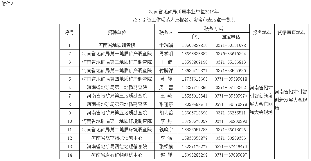 2.河南省地礦局所屬事業(yè)單位2019年招才引智工作聯(lián)系人及報名地點一覽表