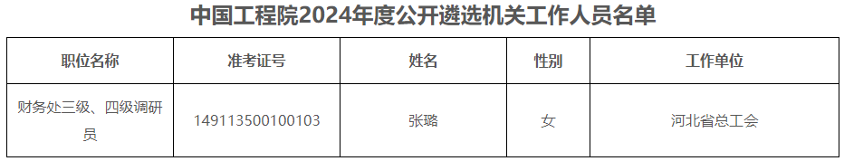 ????根據中央機關2024年度公開遴選公務員工作有關要求,經過筆試、面試、體檢和考察等程序,經研究,擬遴選張璐同志為我院機關工作人員。現予以公示。公示期間如有異議,請向中國工程院辦公廳組織人事處反映。