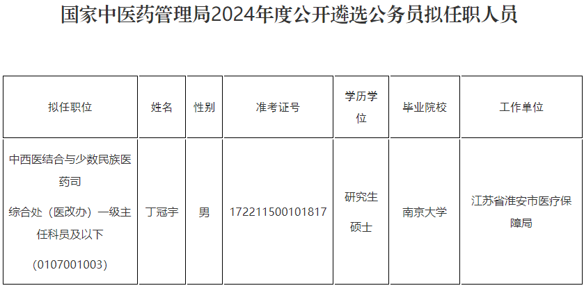 根據(jù)2024年度中央機(jī)關(guān)公開遴選公務(wù)員工作有關(guān)要求,經(jīng)過筆試、面試、體檢和考察等程序,經(jīng)研究,確定丁冠宇同志為國(guó)家中醫(yī)藥管理局公開遴選公務(wù)員擬任職人員,現(xiàn)予以公示。公示期間,如有異議,請(qǐng)向國(guó)家中醫(yī)藥管理局人事教育司反映。