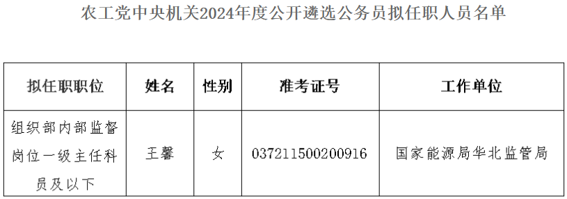根據2024年度中央機關公開遴選公務員工作有關要求,經過筆試、面試、體檢和考察等程序,經研究,確定王馨為農工黨中央機關擬任職人員,現予以公示。公示期間,如對人選有異議,請向農工黨中央組織部反映。