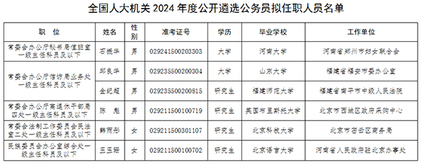 全國(guó)人大機(jī)關(guān)2024年度公開(kāi)遴選公務(wù)員擬任職人員公示