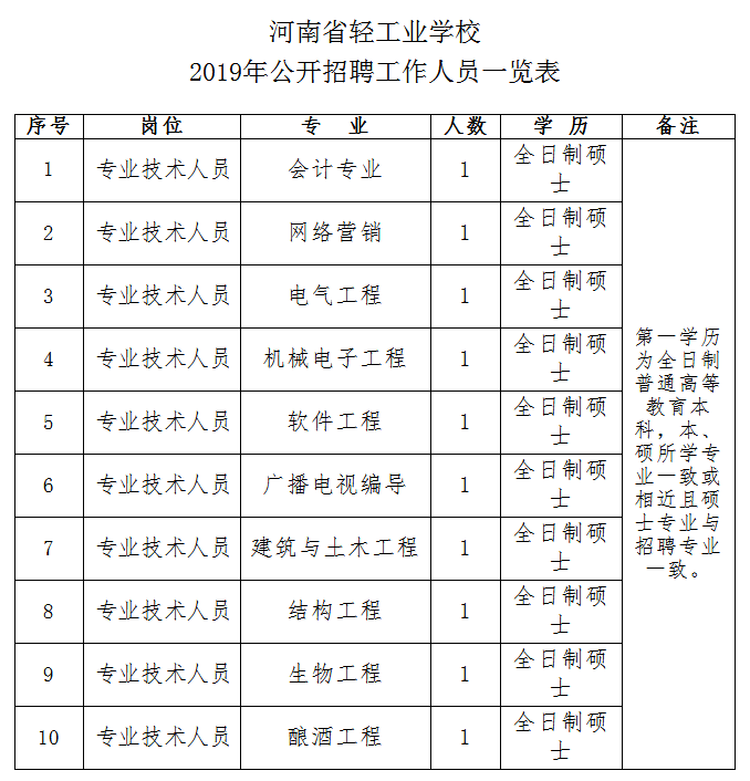 根據我校專業技術人員崗位空缺情況和學校發展需要,招聘10名全日制碩士畢業生。詳見附件《河南省輕工業學校2019年公開招聘工作人員一覽表》。