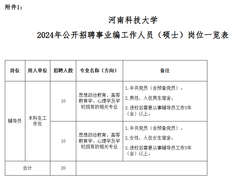 詳見附件《河南科技大學2024年公開招聘事業(yè)編工作人員(碩士)崗位一覽表》《河南科技大學2024年公開招聘人事代理工作人員(碩士)崗位一覽表》。